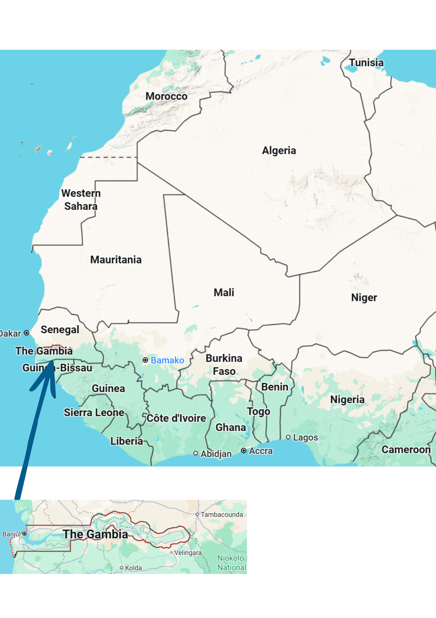 The Gambia is one of the smallest countries on mainland West Africa, a narrow strip of land surrounded by Senegal and stretching along the Gambia River to a short Atlantic coastline. Home to around 2.6 million people, a large share of the population lives in rural communities where access to basic services like healthcare is limited.